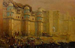 Varanasi held a special fascination for him, leading to more than 18 visits to the mystical city. The gentle waters of the Ganges, the boat rides, the morning worship at the Ghats, as well as the majestic architecture has been aptly arrested by the artist. He also painted landscapes from Kerala, Rajasthan, Kashmir, and Goa, along with large commission canvases like Hyde Park and the Gateway of India.